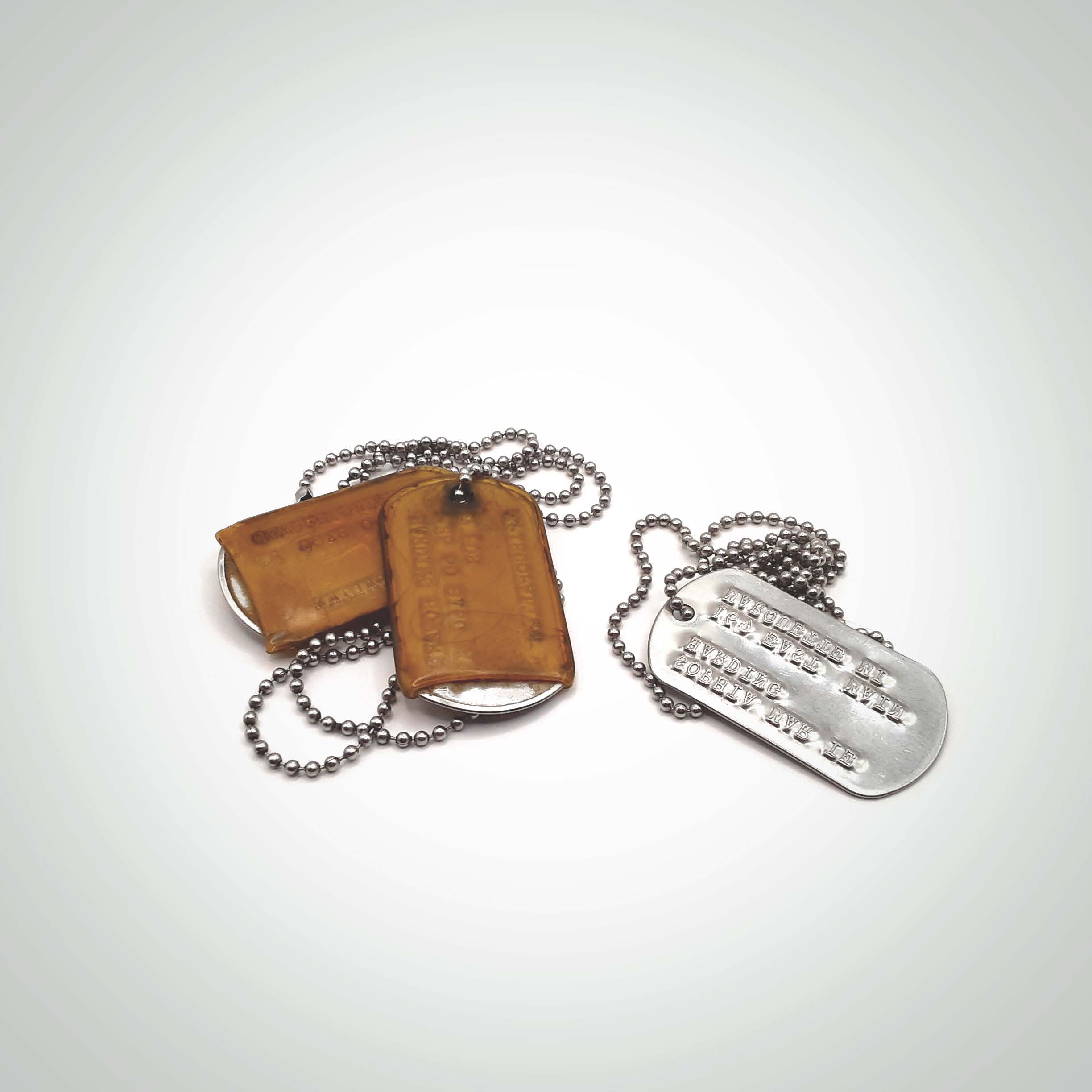 Dogtags came into usage in the Miliary shortly prior to the World Wars. Soldiers were issued dogtags in pairs: one to be left on the body as identification if they were killed; one to be brought back to the base as proof of death if the body had to be left behind. By Vietnam, the tags held the owner’s name, blood type (in case of medical need), and religious affiliation (in case of death). They were frequently covered in dull plastic sleeves so that they wouldn’t clink or reflect light at inconvenient times.
